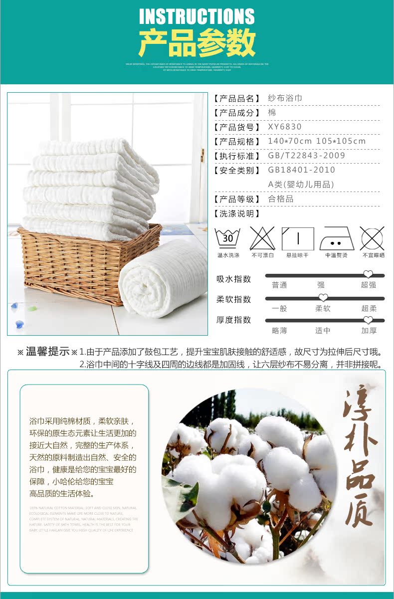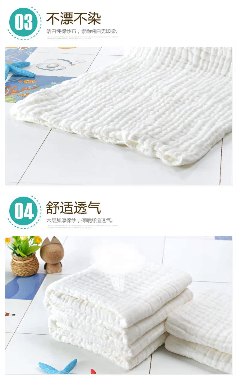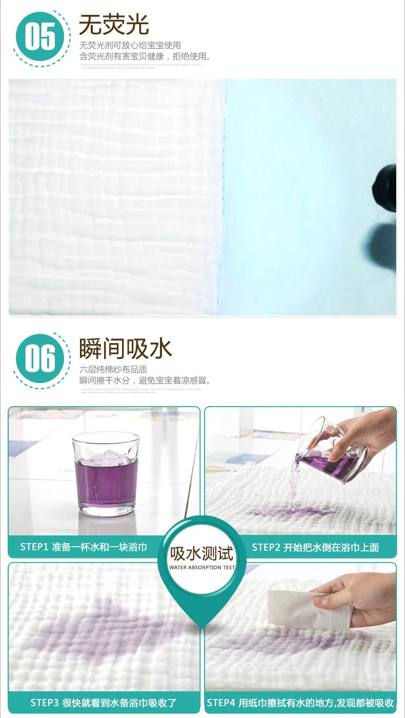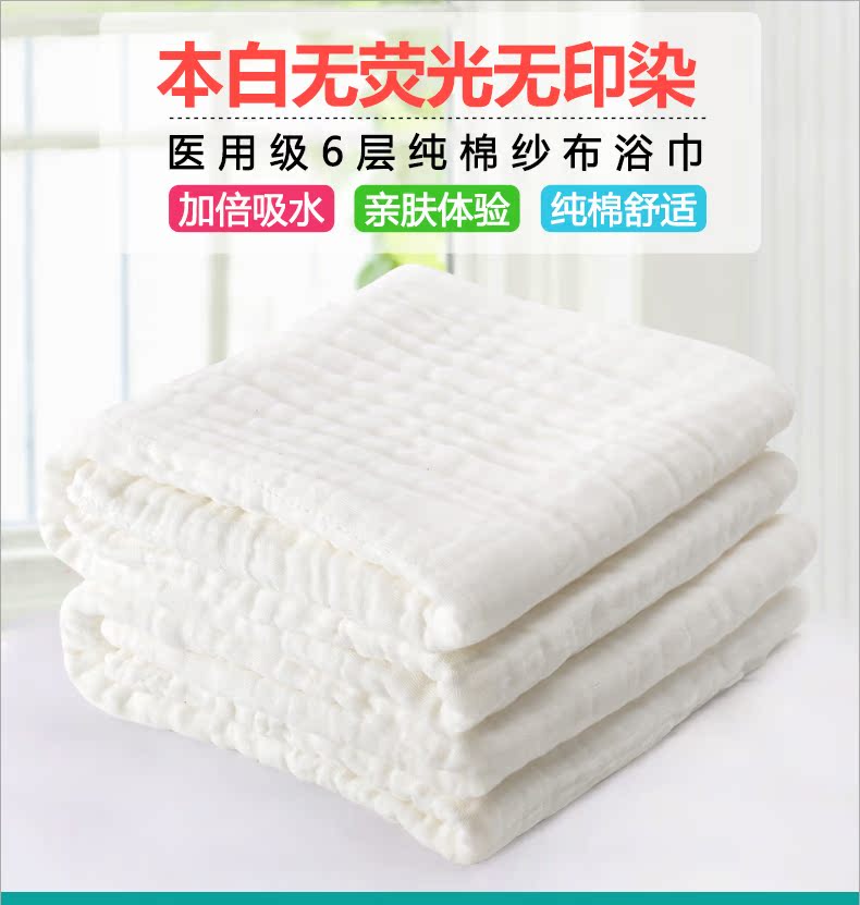 | 6層純棉紗布浴巾,瞬間吸水,無印染,無熒光,舒適放心。 |