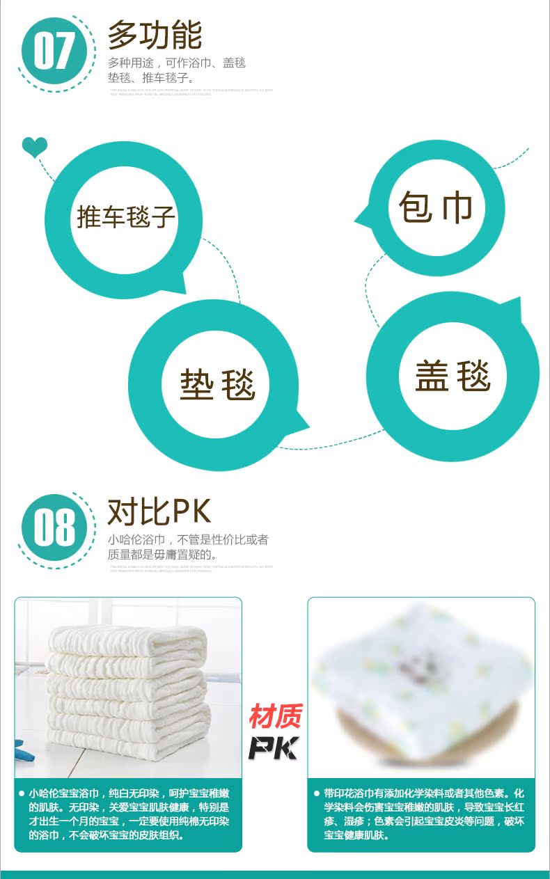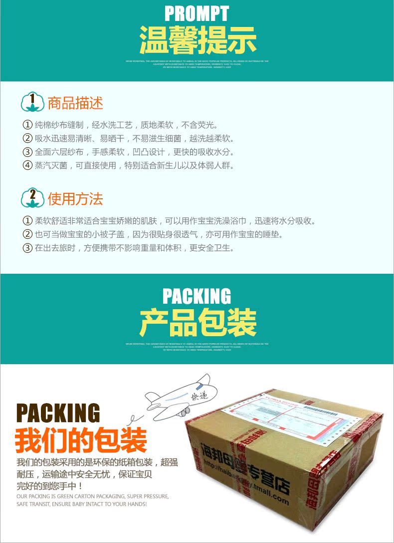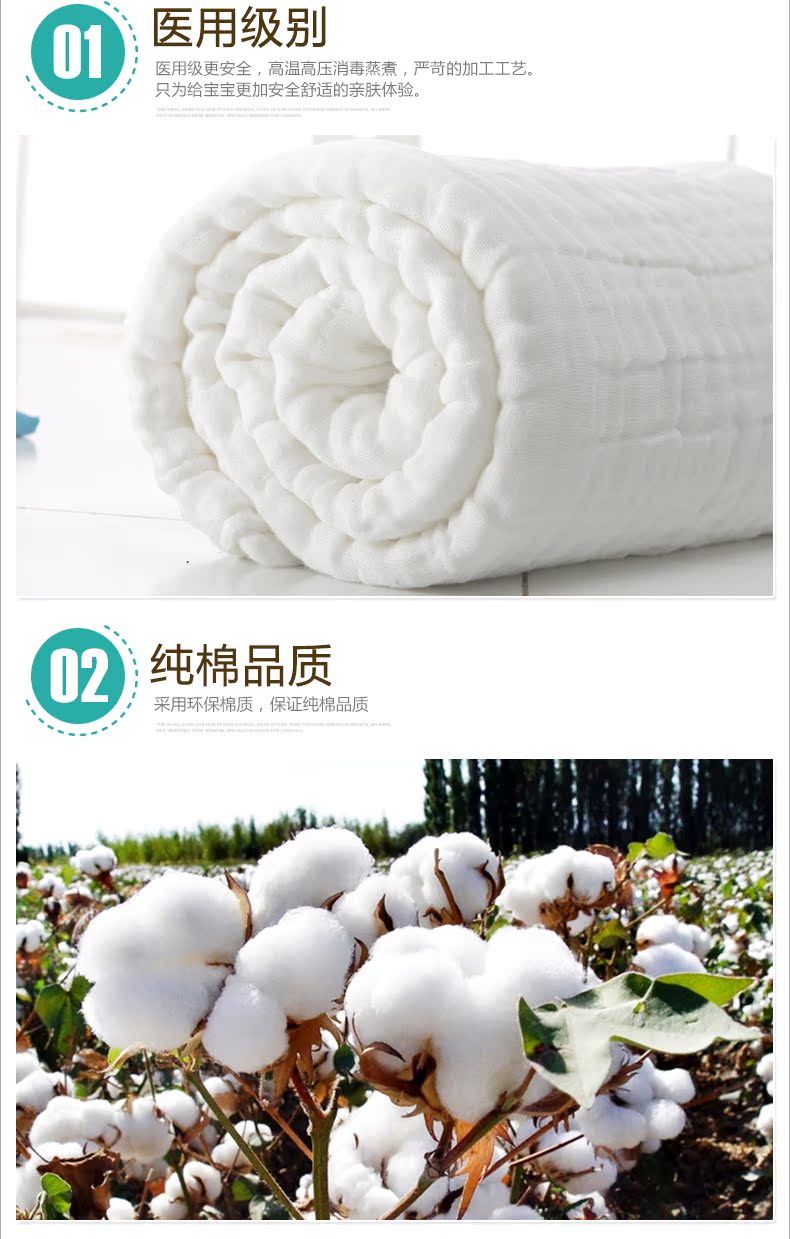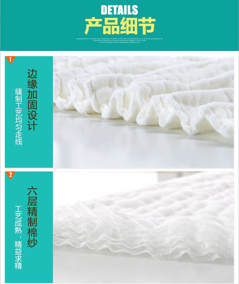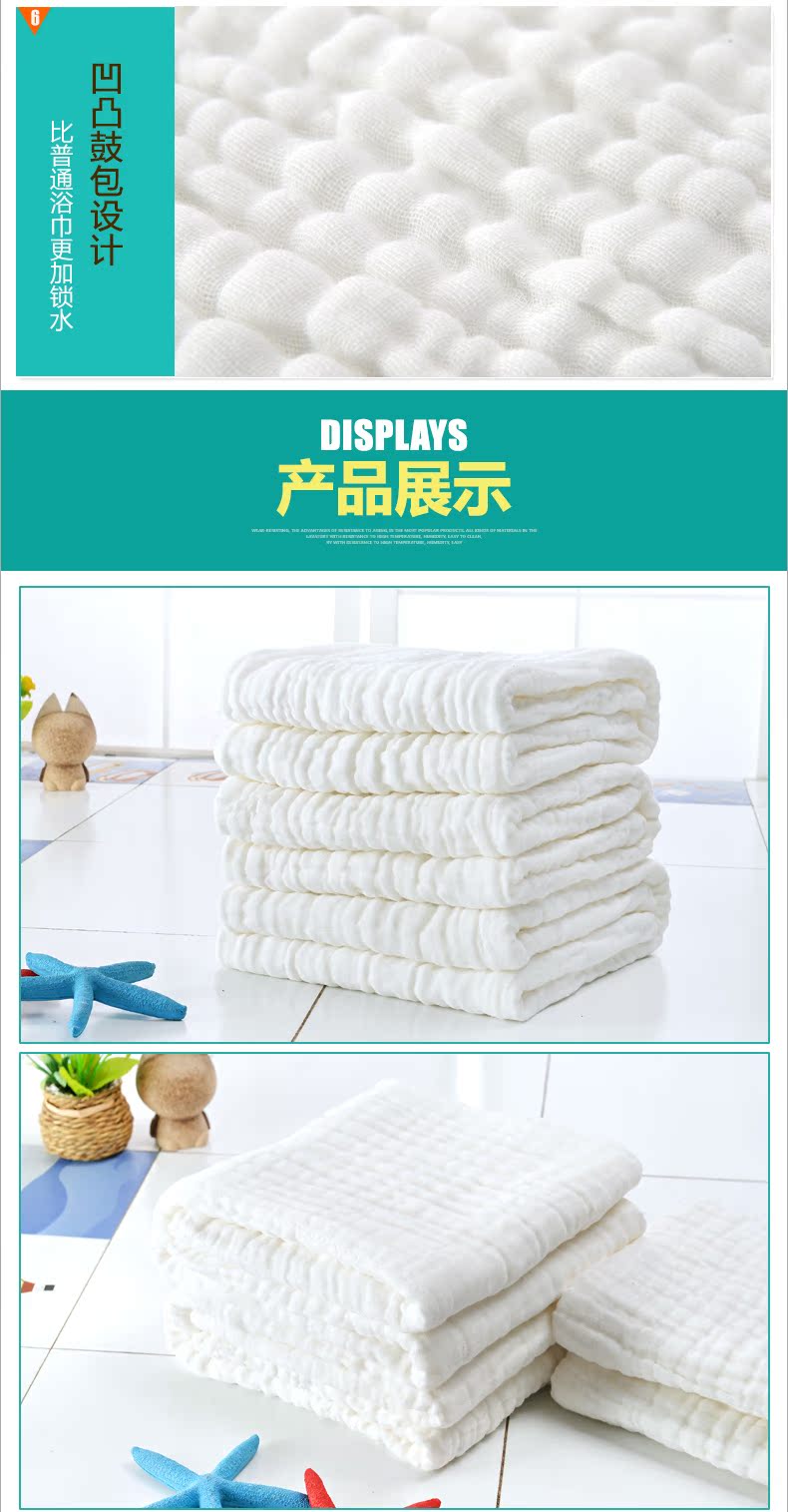 | 6層純棉紗布浴巾,瞬間吸水,無印染,無熒光,舒適放心。 |